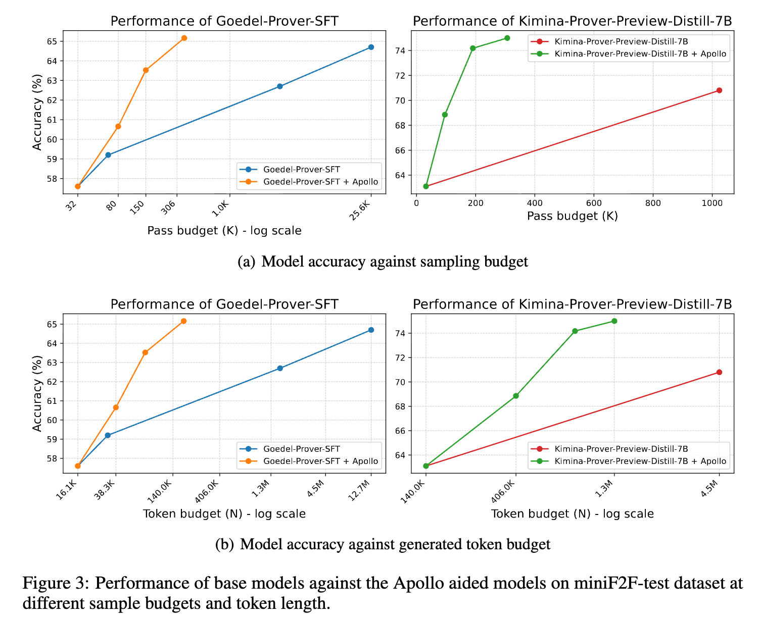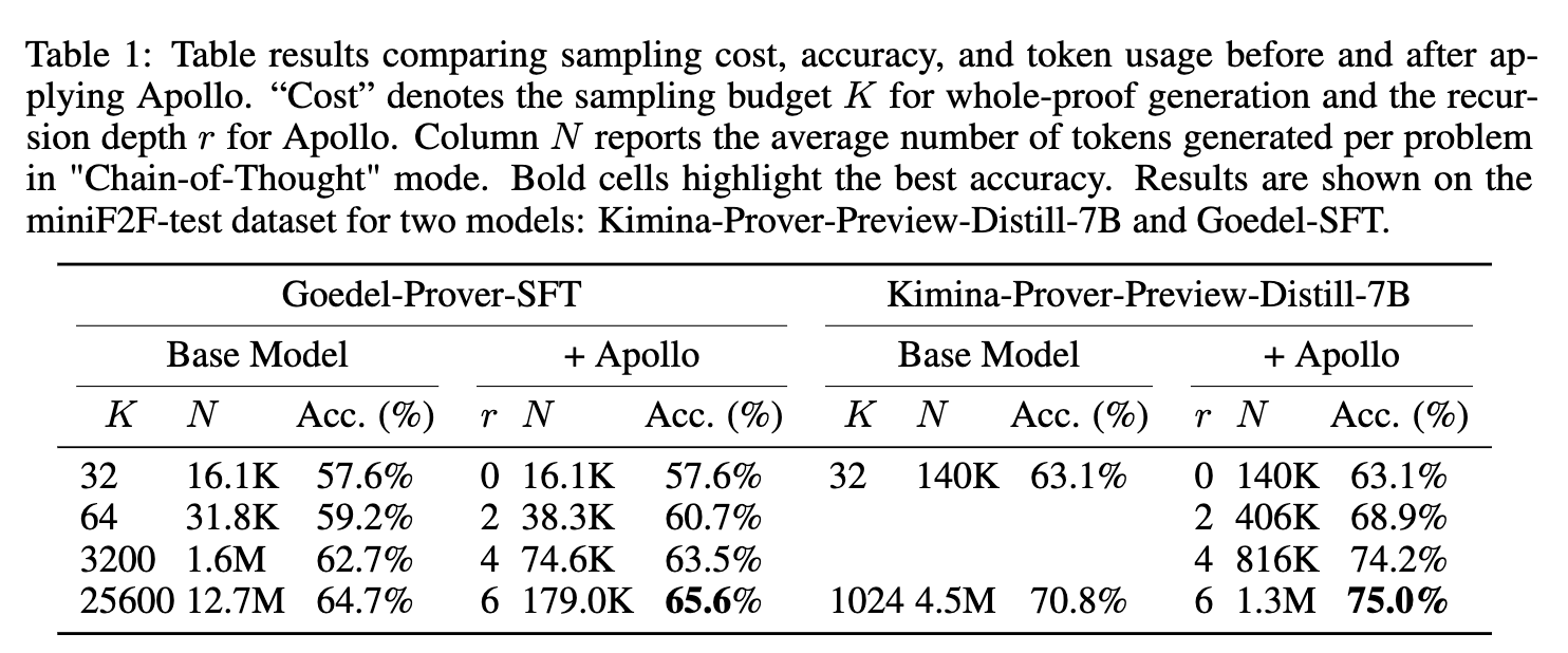 Applying the Apollo pipeline to Goedel-Prover-SFT yields an accuracy of 65.6% using an average of 362 generated samples per problem. By comparison, the standalone base model reaches 64.7% accuracy utilizing a sample budget of 25,600. For Kimina-Prover-Preview-Distill-7B, Apollo produces an accuracy of 75.0% using an average of 307 samples, compared to the base model’s 70.8% at a sample budget of 1,024. Table 1 details the accuracy and token usage scaling.