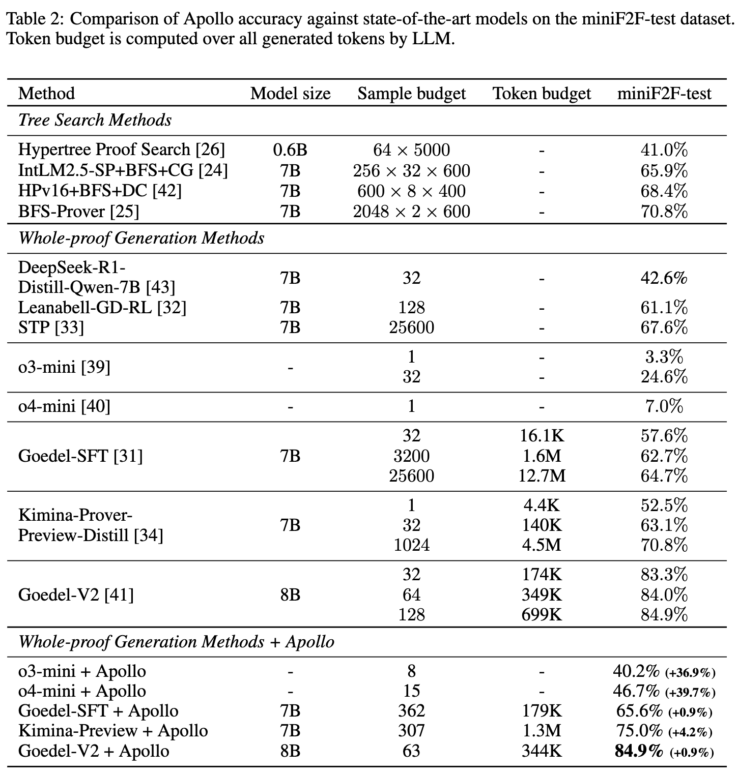 When integrated with the Goedel-V2-8B theorem prover, Apollo yields an accuracy of 84.9% with an average sampling budget of 63, whereas the standalone model requires a budget of 128 to reach the same accuracy. On general-purpose models not explicitly trained for Lean 4 (OpenAI o3-mini and o4-mini), base accuracies of 3.3% and 7.0% increase to 40.2% and 46.7%, respectively, after applying Apollo’s syntax corrections and solver-guided refinements.
