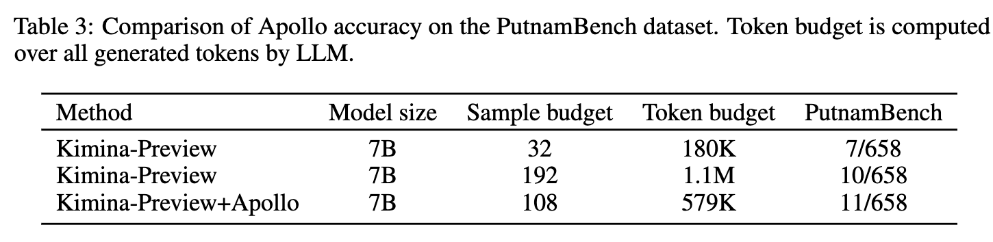 Evaluation on PutnamBench using Kimina-Prover-Preview-Distill-7B as the base model shows that Apollo produces 11 valid proofs using 579K tokens, whereas the standalone model produces 10 valid proofs using 1.1M tokens.