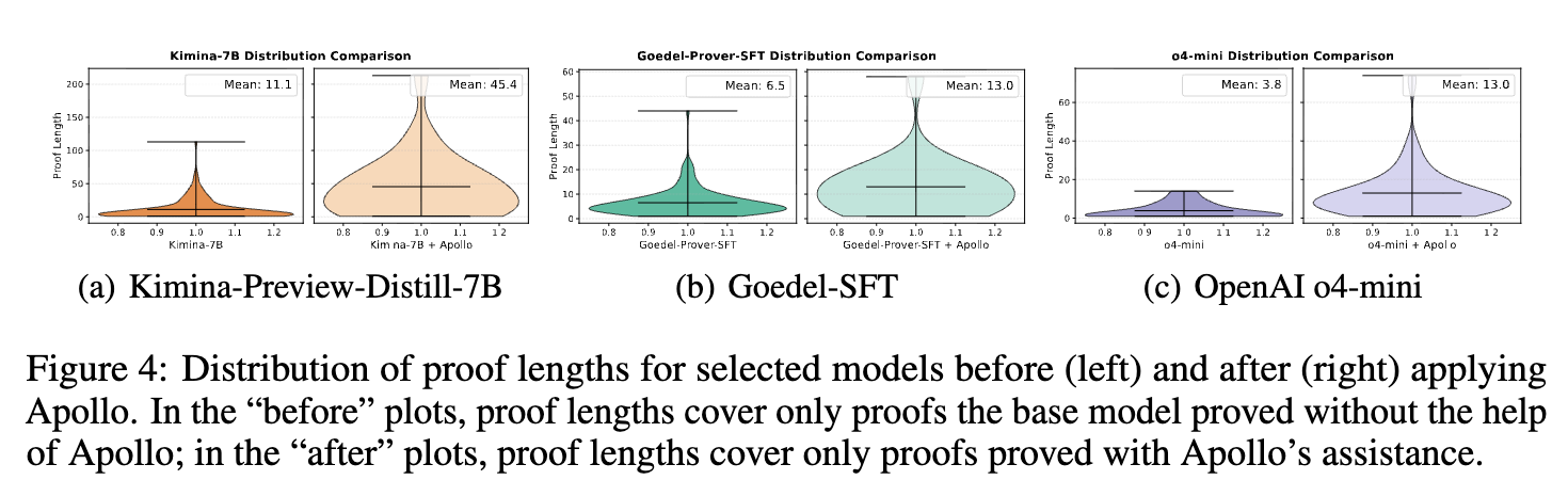 For proofs generated with Apollo’s assistance, the mean proof length increases by at least a factor of two across all tested base models (Kimina-Prover-Preview-Distill-7B, Goedel-Prover-SFT, and o4-mini) compared to proofs generated independently by the base models.