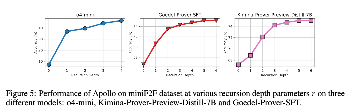 The effect of the recursion-depth parameter \(r\) on accuracy was evaluated for o4-mini (\(r = 0 \dots 4\)), Kimina-Prover-Preview-Distill-7B (\(r = 0 \dots 6\)), and Goedel-Prover-SFT (\(r = 0 \dots 6\)). A depth of \(r = 0\) represents the base model’s standalone performance.