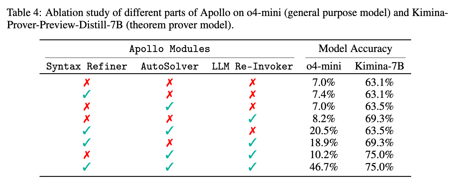An ablation study on the o4-mini and Kimina-Prover-Preview-Distill-7B base models isolated the contributions of the Syntax Refiner, Auto Solver, and LLM Re-invoker. The Sorrifier and Proof Assembler were retained in all configurations as they are required to parse and compile the file.