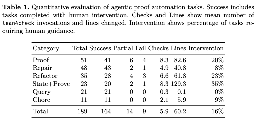 Performance varied based on the task category. The agents achieved a 100% success rate on Query and Chore tasks. For proof-related tasks, the agents demonstrated the highest success rate in Repair tasks (90%, or 43/48), requiring 8% human intervention and an average of 4.9 lean4check invocations. Proof tasks required an average of 8.3 compiler invocations. State and Prove tasks recorded the highest intervention rate at 35% and produced an average of 129 lines of code, as they required the agent to resolve ambiguity during the translation of natural language into formal specifications. Refactor tasks averaged 6.6 compiler invocations.