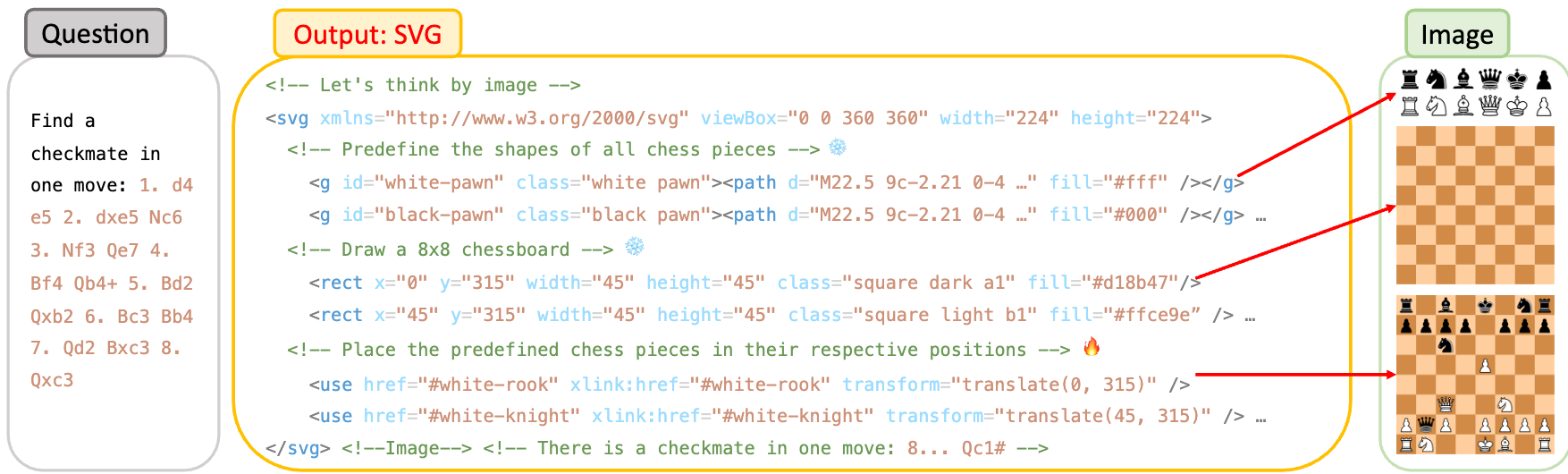 For chess problems, the model uses SVG to define chess piece shapes, draw an 8x8 board, and place the pieces according to a given game state. Similar to the geometry task, an <!--Image--> token triggers the conversion of the current board state into an image, which is then used by the model to predict the next best move, such as a checkmate.