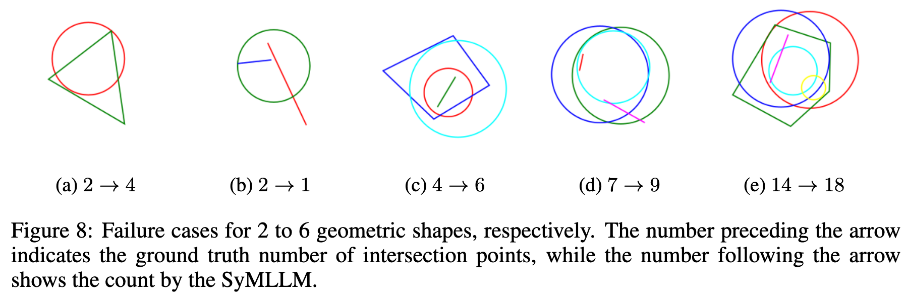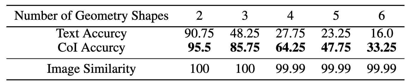 Results: The SyMLLM framework achieved nearly 100% image similarity, indicating high accuracy in converting coordinates to images. The model using CoI consistently outperformed the text-only baseline in counting intersection points. For problems with 4 shapes, accuracy increased from 27.75% to 64.25%. For problems with 6 shapes, accuracy increased from 16.0% to 33.25%.
