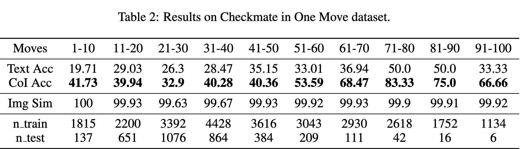 Results: The model achieved nearly 100% accuracy in generating the correct chessboard images. The CoI approach outperformed the text-only baseline across all game lengths. For games between 11-20 moves, accuracy improved from 29.03% to 39.94%. For games between 61-70 moves, accuracy improved from 36.94% to 68.47%. Performance generally improved as the number of moves increased, which corresponds to a smaller set of possible legal moves.