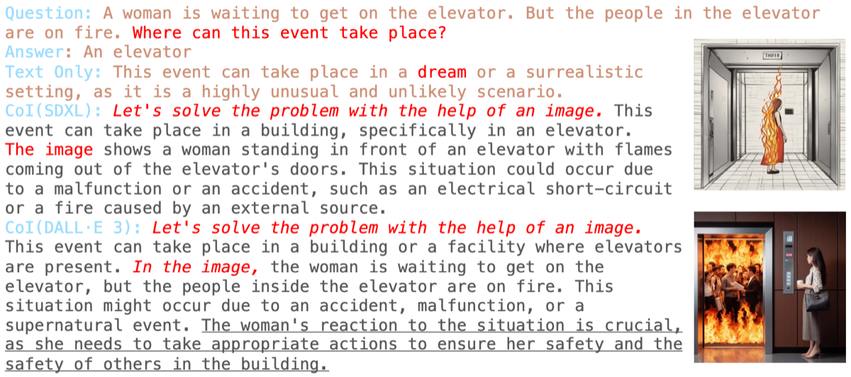 Model and Setup: Instead of training a new generative model, this experiment used existing models (SDXL and DALL-E 3) to generate images from the text descriptions. A pre-trained LLaVA-13B model was then used to reason about the generated images, prompted by “Let’s solve the problem with the help of an image.” The baseline was a text-only Vicuna-13B model.