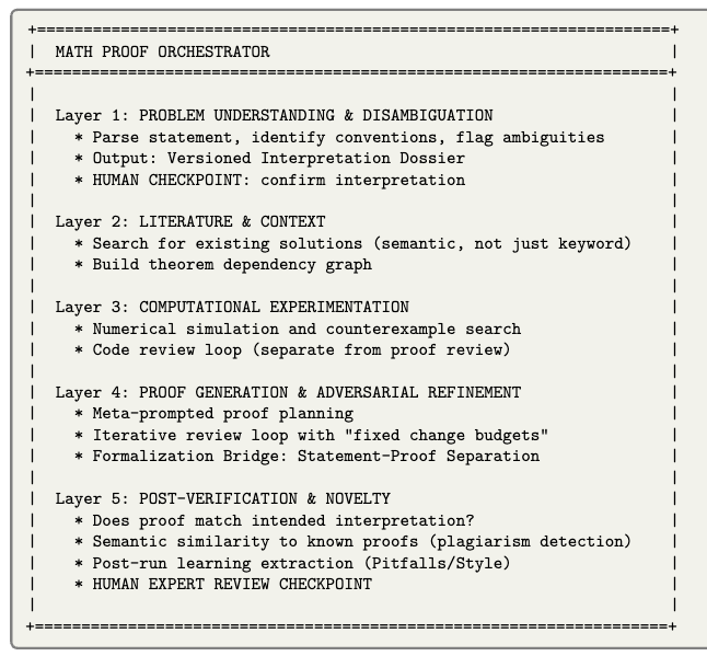 A five-layer orchestration architecture for AI-assisted mathematical proof development incorporating computational experimentation, adversarial review, and formal verification.
