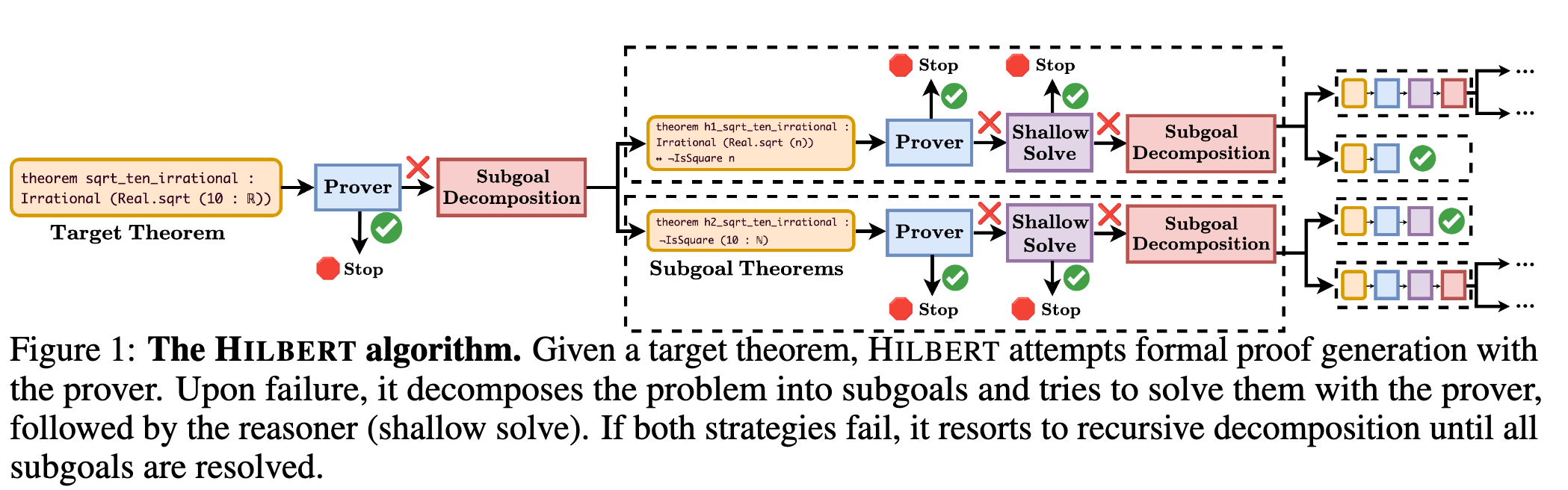 - Recursive Decomposition and Proof Assembly: Subgoals remaining unproven after the previous steps undergo recursive subgoal decomposition. Each subgoal is subdivided until it is proven or the process reaches the maximum recursion depth \(D\). If all subgoals are proven, the system concatenates the subgoal proofs with the assembled proof outline to yield the complete proof. If any subgoals remain unsolved, the current proof attempt fails, prompting a restart of the decomposition process for the parent theorem.