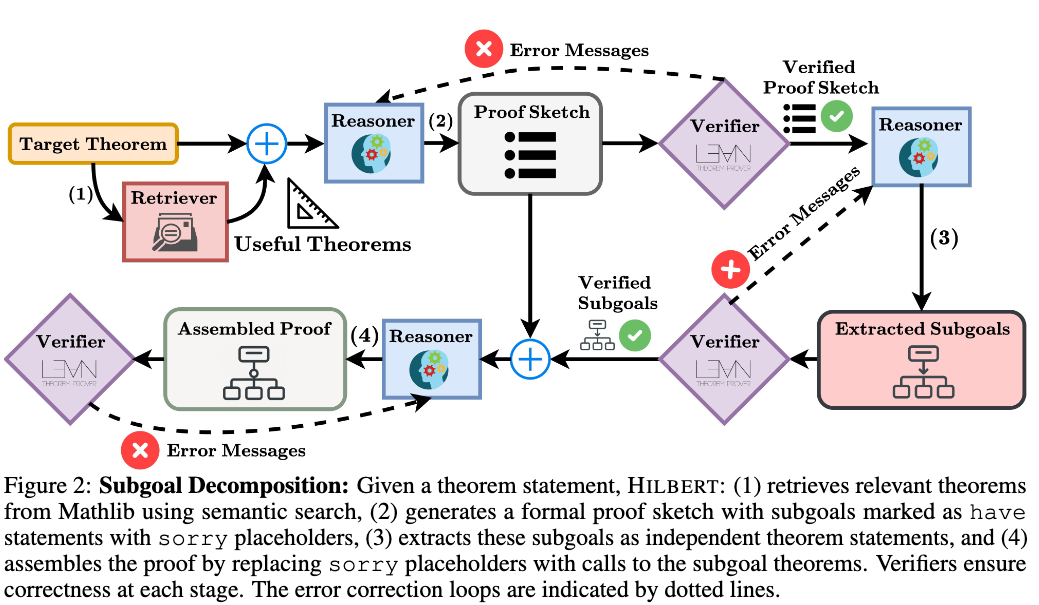 HILBERT is a multi-agent system that connects informal mathematical reasoning with formal verification. It applies recursive subgoal decomposition to divide complex theorems into simpler subgoals. The system coordinates four components: