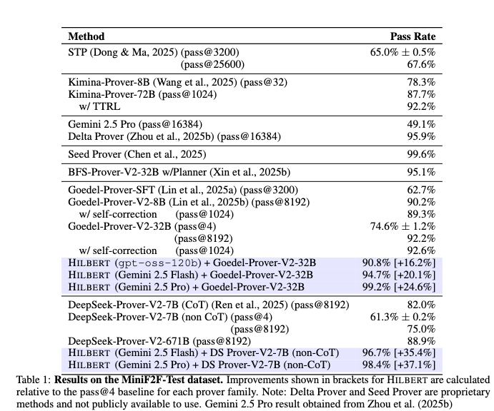 The configuration combining Gemini 2.5 Pro with Goedel-Prover-V2-32B achieves a 99.2% pass rate, failing on two problems. Combining DeepSeek-Prover-V2-7B with Gemini 2.5 Pro yields 98.4%, while pairing it with Gemini 2.5 Flash yields 96.7%. Using the open-weights model gpt-oss-120b alongside Goedel-Prover-V2-32B results in a 90.8% pass rate.