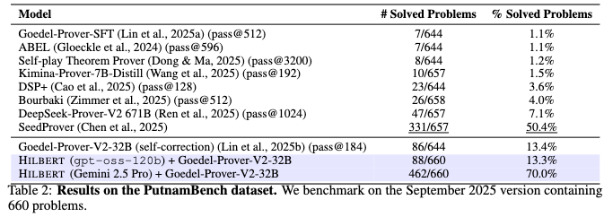 PutnamBench: This benchmark consists of 660 undergraduate-level problems from the William Lowell Putnam Mathematical Competition. The system was tested using the Goedel-Prover-V2-32B Prover.