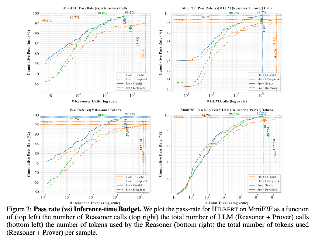 Pass rates scale continuously with the number of calls. The Gemini 2.5 Pro with Goedel Prover configuration reaches its peak pass rate utilizing a maximum of 4.5K Reasoner calls and 11.3K total LLM calls per sample. Models with weaker Reasoners (Gemini 2.5 Flash) require higher inference budgets to reach their respective peak pass rates. Token consumption increases in tandem with pass rate improvements; on MiniF2F, the most challenging problems consume up to 27.0M tokens for the Gemini 2.5 Pro + DeepSeek-Prover-V2 configuration.