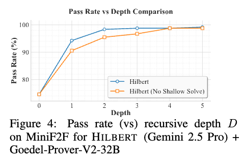 Performance increases monotonically with depth. The full system reaches a 98.36% pass rate at \(D=2\) and 98.7% at \(D=3\). An ablated version with the shallow solve mechanism disabled (\(K_{\text{informal passes}} = 0\)) requires a greater recursion depth to reach comparable performance.