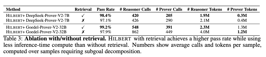 Including retrieval increases the pass rate and decreases inference-time compute utilization. For the DeepSeek-Prover-V2-7B configuration, retrieval increases the pass rate from 97.1% to 98.4%, reduces average Reasoner calls per problem from 426 to 420, and lowers average Reasoner tokens from 2.1M to 1.9M. For the Goedel-Prover-V2-32B configuration, retrieval increases the pass rate from 97.9% to 99.2%, while decreasing average Reasoner calls from 862 to 548 and average Reasoner tokens from 4.0M to 2.3M.