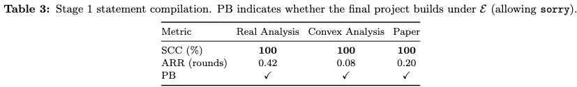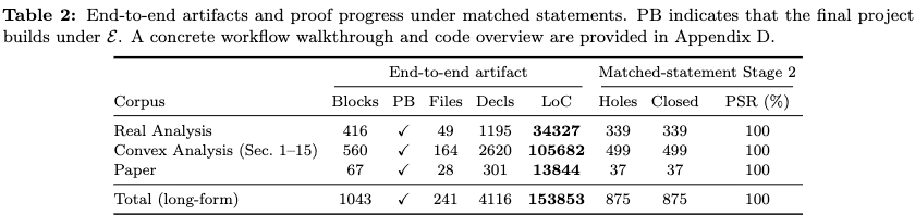 End-to-End Buildability and Statement Compilation Running the pipeline end-to-end on the 479 pages of long-form sources produced a Lean artifact consisting of 241 files, 4,116 declarations, and 153,853 lines of Lean code that builds successfully under the fixed environment \(\mathcal{E}\).