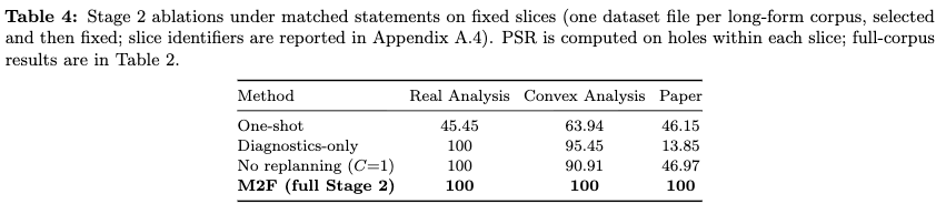 Ablation studies on fixed dataset slices demonstrated the impact of different context constraints during repair. Removing structured goal/context conditioning (diagnostics-only) or disabling plan revision (no replanning) reduced the proof success rate (PSR), particularly on the research paper corpus where implicit dependencies are more frequent.