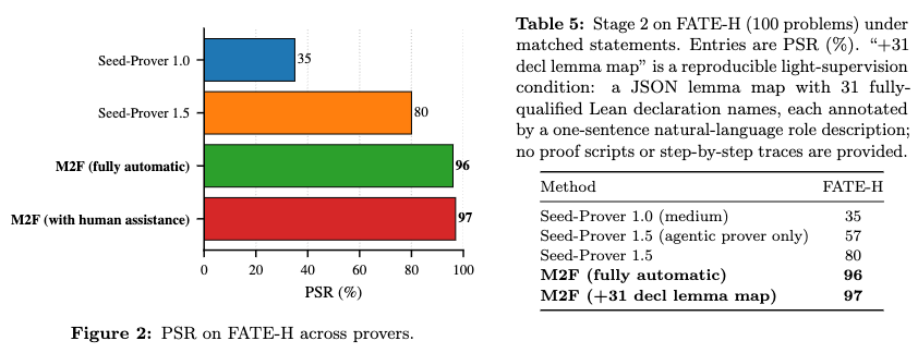 On the FATE-H benchmark, where statements already elaborate in Lean, Stage 2 was evaluated in isolation. The system achieved a 96% proof success rate fully automatically. Providing a reproducible light-supervision condition—a mapping of 31 fully-qualified Lean declaration names with one-sentence natural language descriptions, without formal proof scripts—resulted in a 97% success rate.