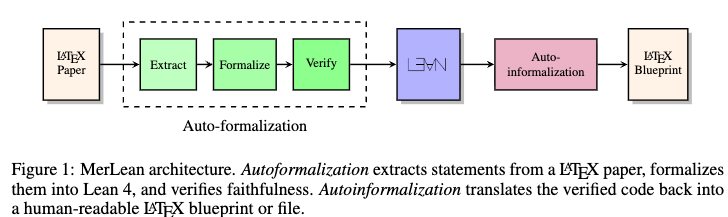 MerLean is a bidirectional framework composed of two pipelines: autoformalization, which translates mathematical research papers from LaTeX into verified Lean 4 libraries built on Mathlib, and autoinformalization, which converts the formal code back into human-readable LaTeX. The framework utilizes a large language model agent to perform multi-turn interactions.