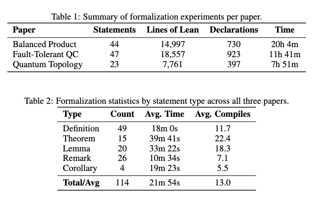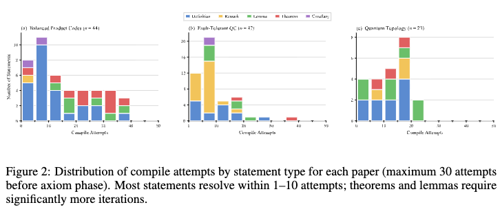 Across the three papers, the system formalized 114 statements into 2,050 Lean declarations in under 42 hours of wall-clock time. Paper A required explicit axioms for 9.1% of its statements due to missing Mathlib machinery (e.g., spectral sequences and Künneth isomorphisms for \(\mathbb{F}_2\)-chain complexes). The formalization process showed that theorems required the highest average processing time (39m 41s) and compile attempts (22.4), while remarks required the least (10m 34s and 7.1 attempts).