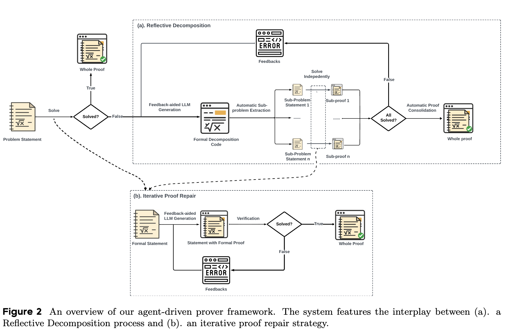 - Iterative Decomposition Repair: If any sub-problems are not solved by the Iterative Proof Repair loop, the failures are logged. The LLM is prompted to regenerate the proof sketch \(D\) with a revised decomposition strategy, using the list of unsolved sub-problems as feedback.