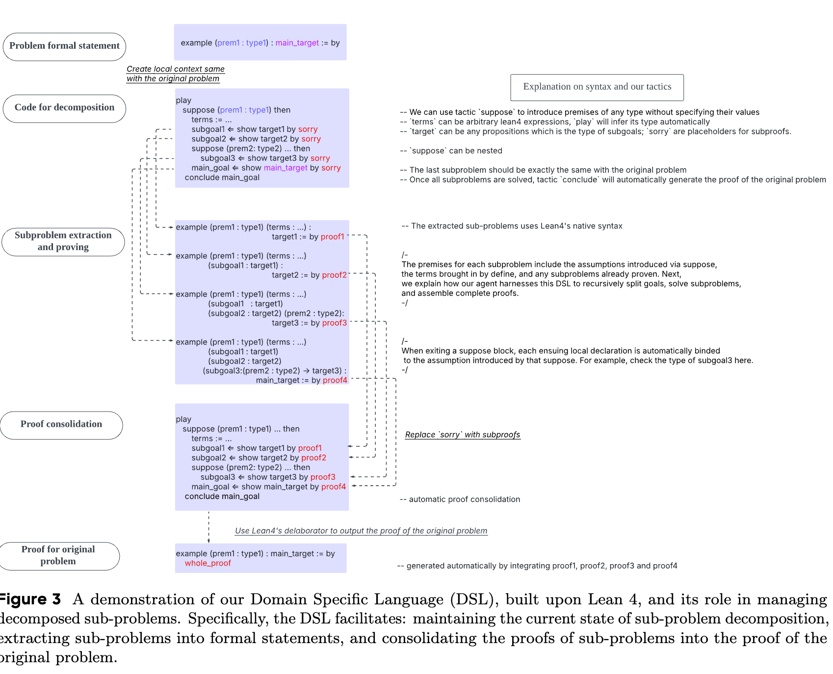 For proofs that require multiple steps, the framework breaks down the original problem into sub-problems.
