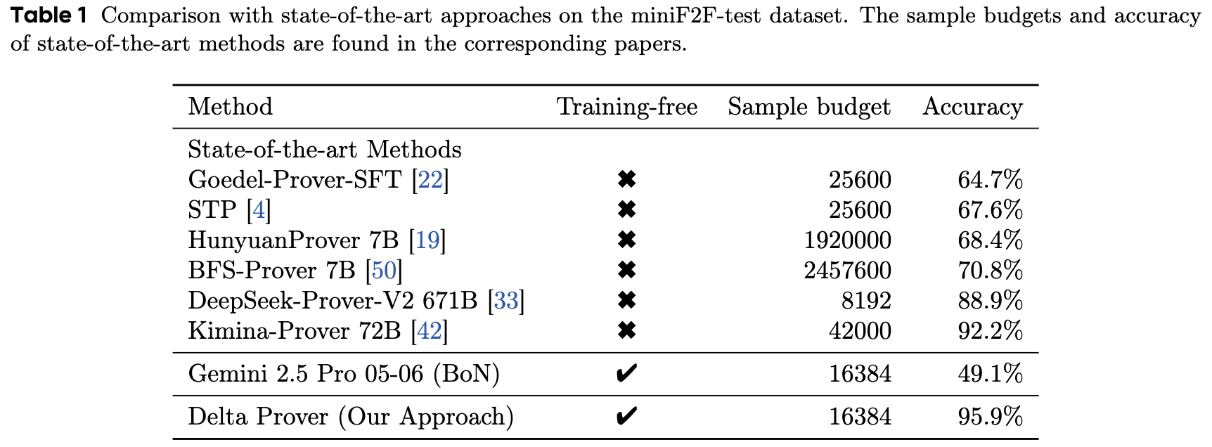 Delta Prover is evaluated against baseline provers on the miniF2F-test benchmark. Sample budgets are determined by recording the number of API calls used for a successful attempt and taking the maximum across all solved problems.