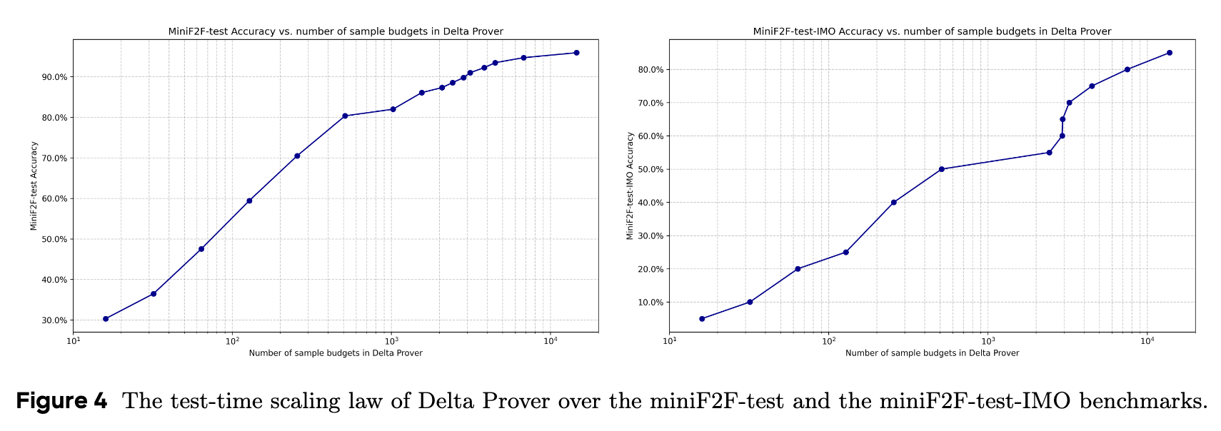 Delta Prover achieves an accuracy of 95.9% on miniF2F-test using a sample budget of 16384 API calls. The test-time scaling properties are tracked by measuring the accuracy relative to the available sample budget.