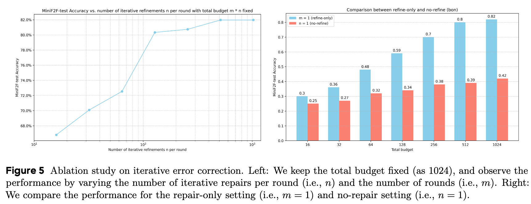 Effect of Iterative Proof Repair The impact of Iterative Proof Repair is tested using only proof construction (without Reflective Decomposition). The total budget is fixed at 1024 API calls. The experiment varies the number of iterative repairs per round (\(n\)) and the number of rounds (\(m\)).