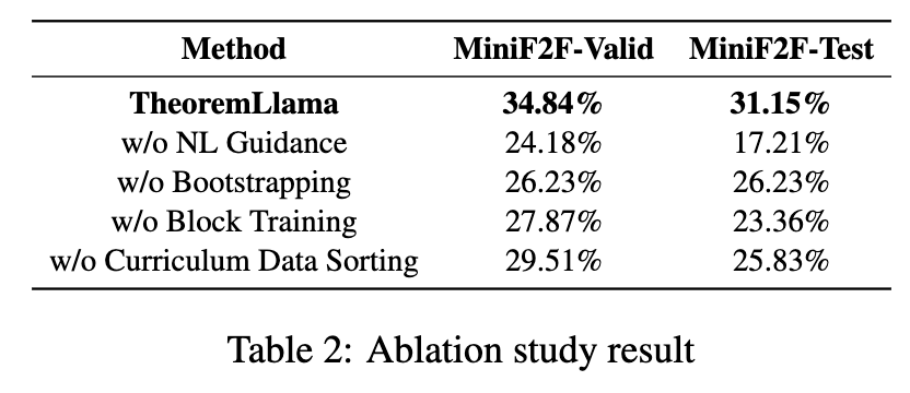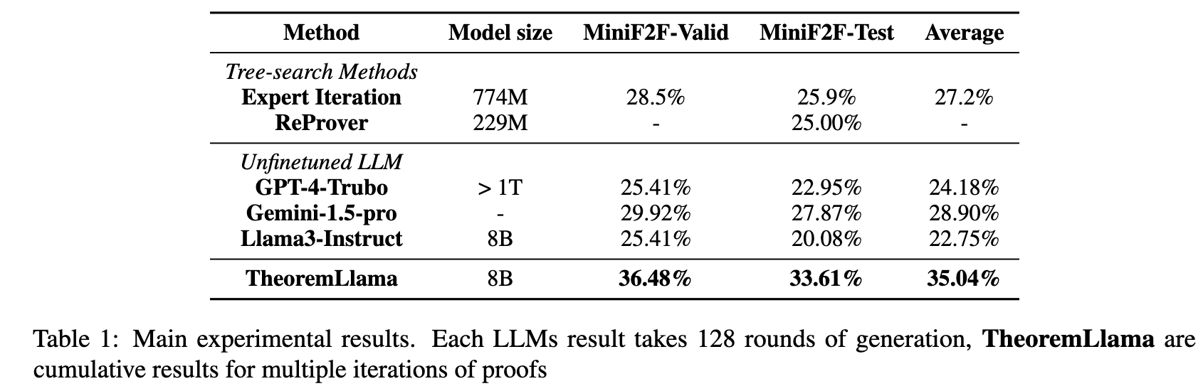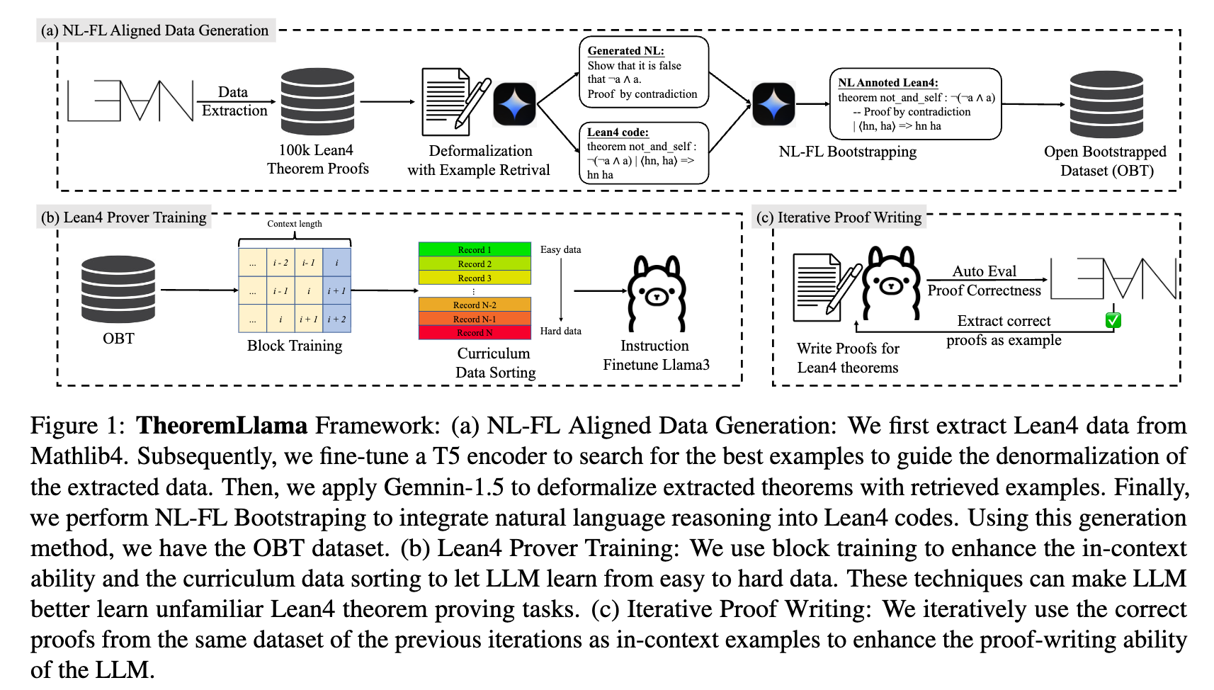 Implementation Details The OBT dataset was generated using Gemini-1.5-Pro-0409. Instruction fine-tuning on Llama3-Instruct-8B was performed using 1,000 warm-up steps and a learning rate of \(1\times 10^{-5}\). During evaluation, 128 uniform generations are performed per theorem. Iterative proof writing is stopped at the second round.