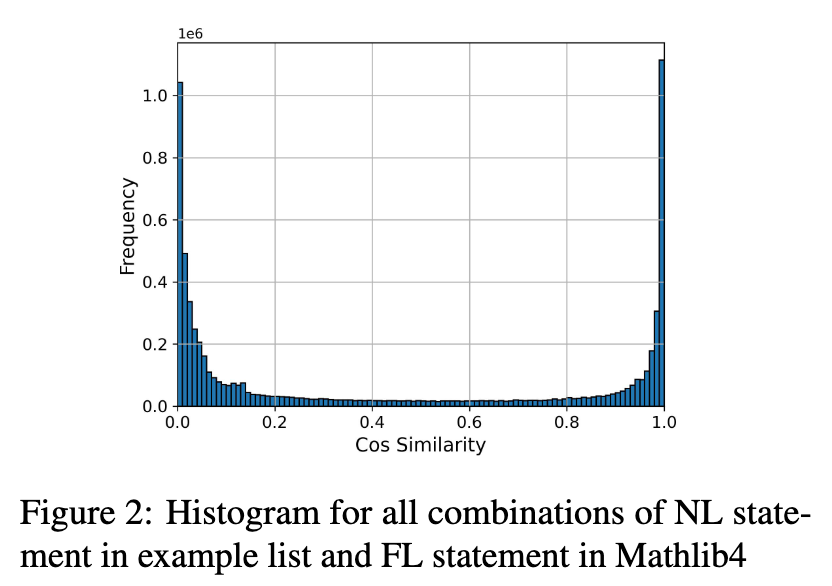 \[\mathcal{L} = 1 - \cos(\boldsymbol{x}_{NL}, \boldsymbol{x}_{FL}) + \frac{1}{2}(\cos(\boldsymbol{x}_{NL}^{(-)}, \boldsymbol{x}_{FL}) + \cos(\boldsymbol{x}_{NL}, \boldsymbol{x}_{FL}^{(-)}))\]where \(\boldsymbol{x}_{NL/FL}\) represents the sentence encoding and \(\boldsymbol{x}^{(-)}\) denotes an unaligned NL/FL statement in the same batch used as a negative sample. Examples with the highest similarity are retrieved and used as in-context prompts for Gemini-1.5-Pro to generate the natural language statements and proofs for the Mathlib4 theorems. Repeated or over-length generations are filtered out during a quality check.