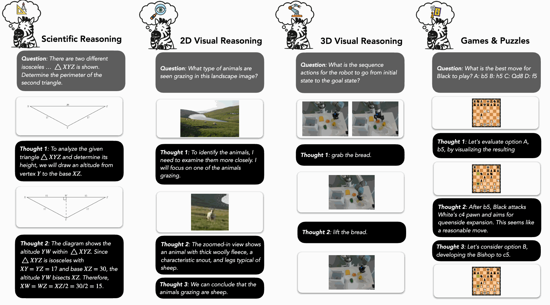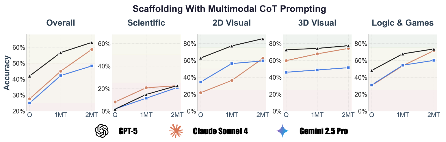A scaffolding experiment was conducted to evaluate the performance of proprietary models (GPT-5, Gemini-2.5 Pro, Claude-4 Sonnet) on a subset of 512 questions from Zebra-CoT. The dataset’s reasoning traces are structured as a sequence: <question> → <text-reasoning-1> → <visual-reasoning-1> → ... → <answer>.