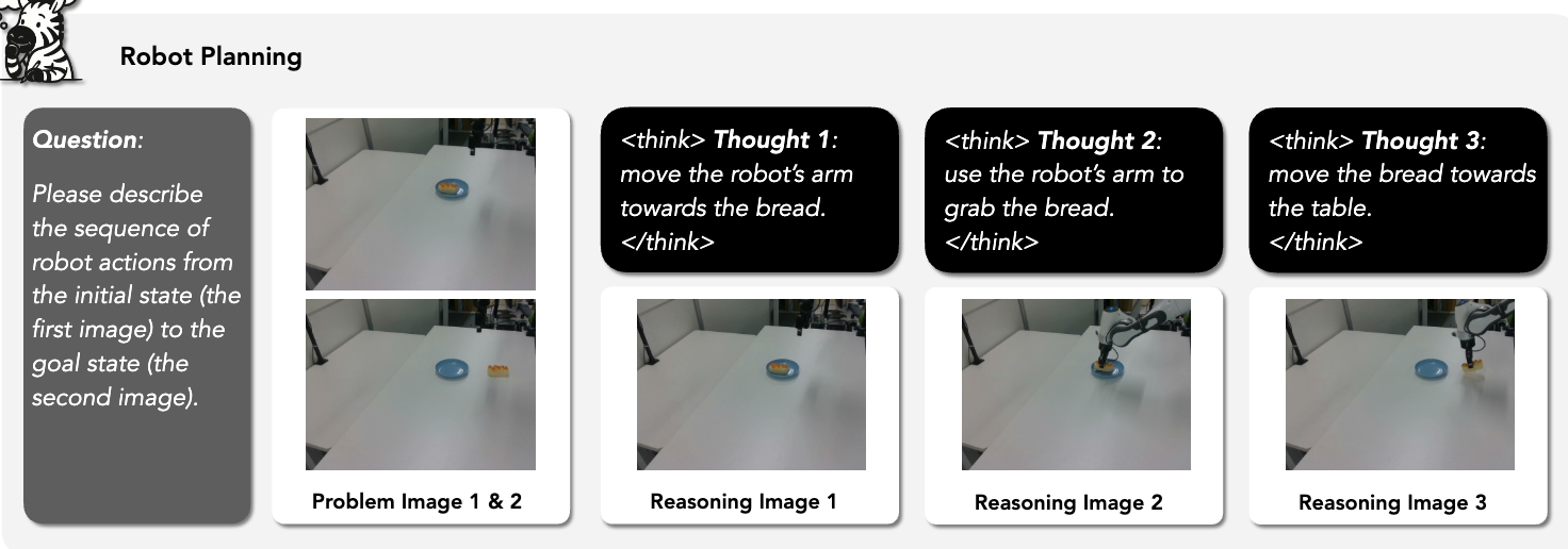 - 3D Visual Reasoning: This area focuses on embodied reasoning/robotic planning and understanding 3D transformations. For planning, the ALFRED and RoboMIND benchmarks are adapted into image goal-conditioned planning tasks where models generate step-by-step plans. For 3D transformations, multi-hop object counting tasks are designed, requiring models to reason through sequential modifications to a scene.
