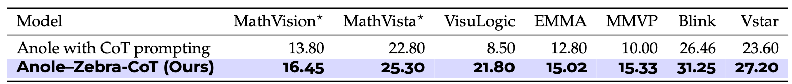- When evaluated on seven external visual reasoning benchmarks, the fine-tuned model showed an average performance improvement of 4.9%, with a gain of up to 13.1% on a visual logic benchmark compared to the base Anole model with CoT prompting.