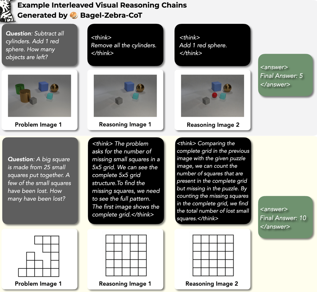 <|vision_start|>token to enable native generation of interleaved text and images.- The fine-tuned model is capable of generating interleaved visual CoT traces for problem-solving, including on tasks outside its training distribution.